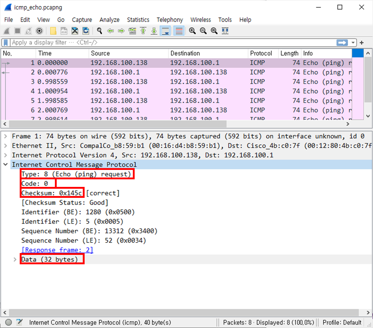6) WireShark 필터에 ICMP 입력하여 해당 값만 보기