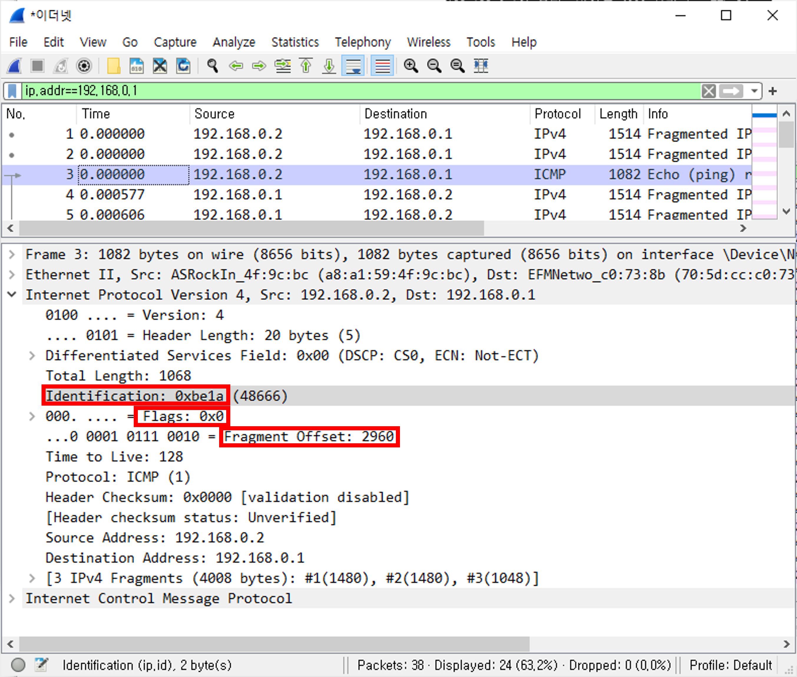 핑이 나가기 전에단편화가 진행이 되어 나감을 확인할 수 있습니다. (id가 동일하고, offset확인하고, flag 확인)