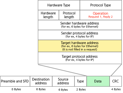 reply는 유니캐스트 방식으로 진행됩니다. ARP는 3계층이지만 기본적으로 2계층을 끼고 돌아가야 합니다. 파란색 칸이 숫자 2면 reply, 1이면 request입니다.