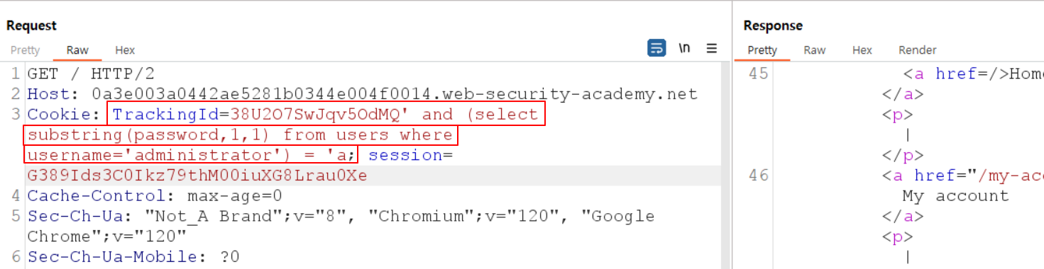 입력 > TrackingId=원본값' and (select substring(password,1,1) from users where username='administrator') = 'a