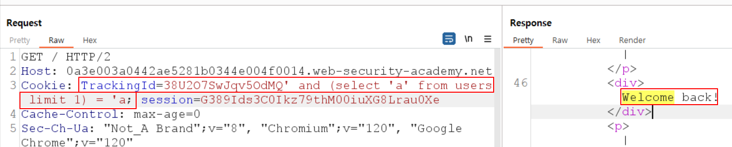 입력 > TrackingId=원본값' and (select 'a' from users limit 1) = 'a