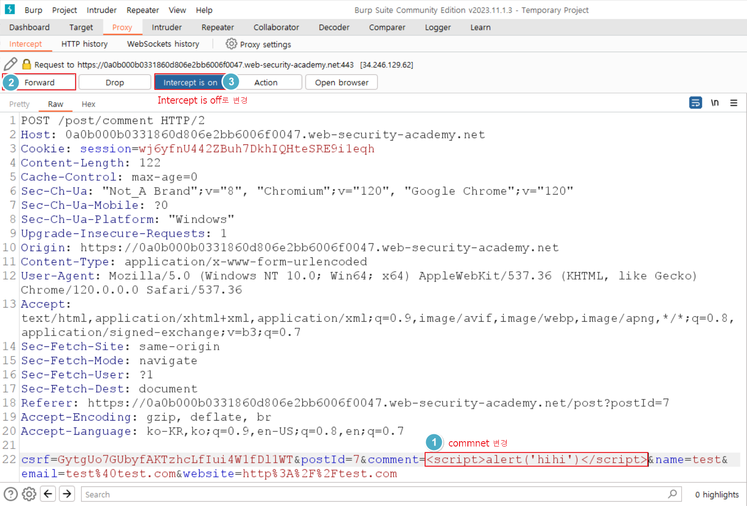 (6) comment 부분에 악성 스크립트 코드를 작성하고 Forward를 클릭하여 스크립트 코드가 실행되는지 확인합니다.