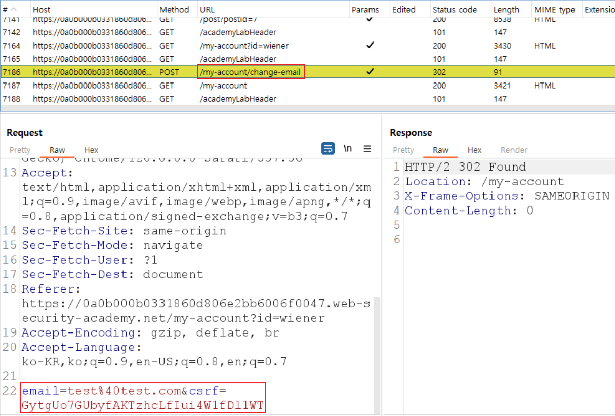 (10) burp suite에서 change-email 패킷을 찾아 이메일이 변경된 것을 확인합니다.