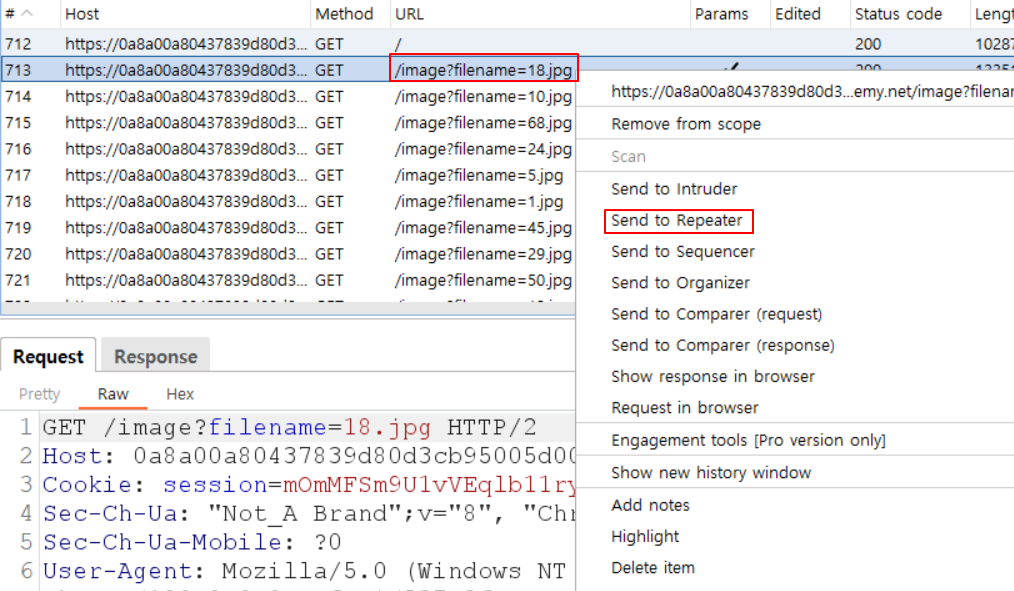 (2) 이미지 패킷 하나를 클릭하고 Repeater로 보냅니다.