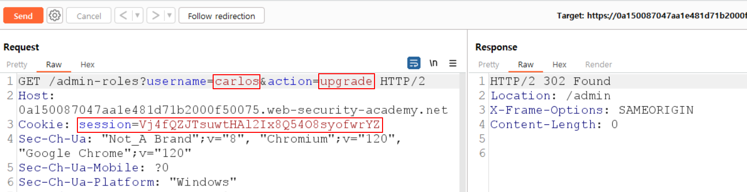 => "username=wiener, session=wiener세션"으로 설정하면 ADMIN으로 업그레이드됩니다.