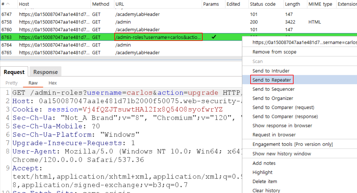 (4) 수집된 패킷 중 carlos 권한 업데이트 패킷을 Repeater로 보내고, 권한 변경을 확인합니다.