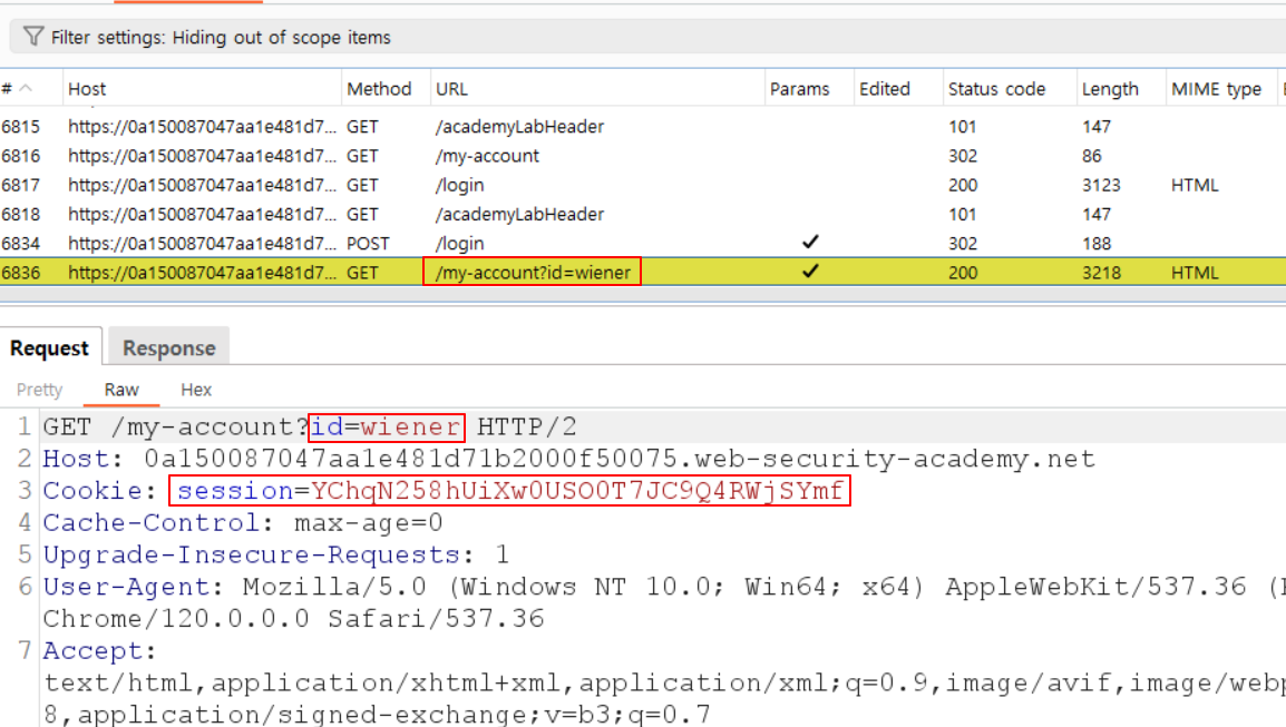 이전에 (4)에서 Repeater로 보낸 패킷에서 username을 wiener로 바꿔줍니다.