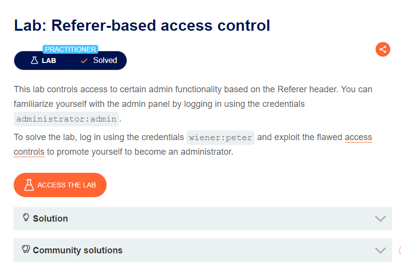 This lab controls access to certain admin functionality based on the Referer header. You can familiarize yourself with the admin panel by logging in using ...