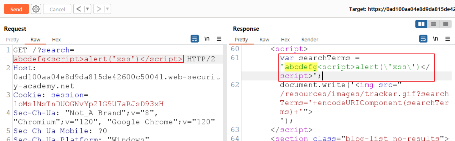 Lab: Reflected XSS into a JavaScript string with single quote and backslash escaped | Web Security Academy