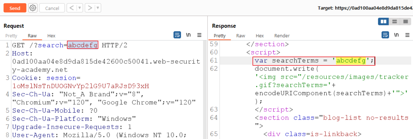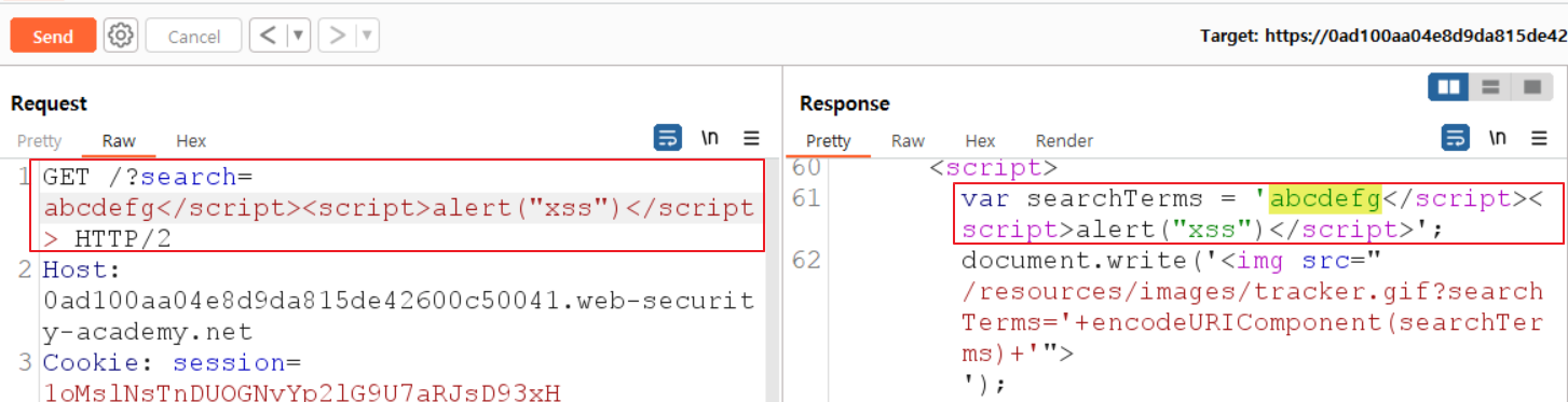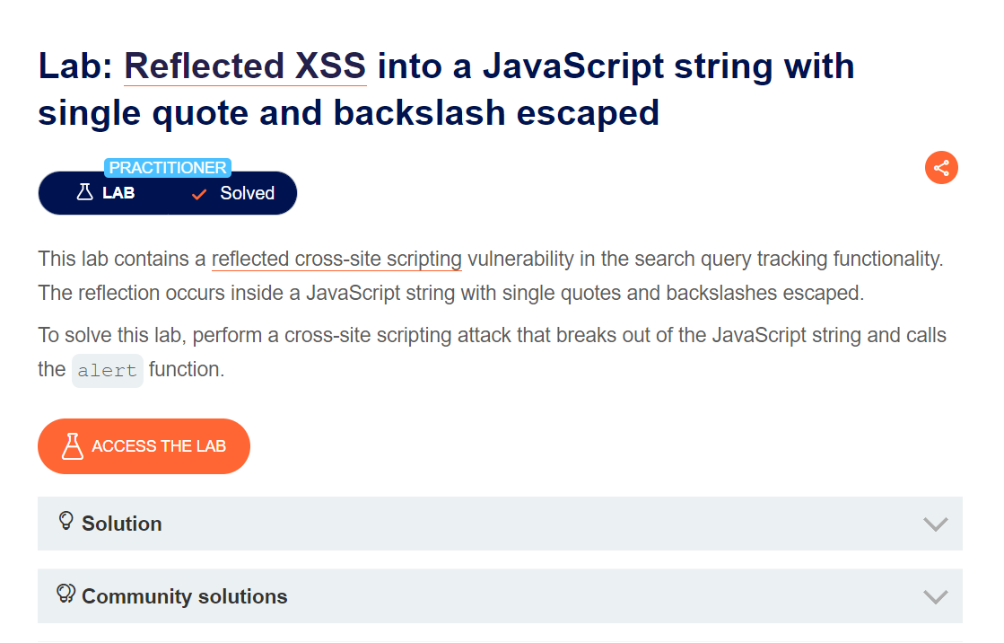 This lab contains a reflected cross-site scripting vulnerability in the search query tracking functionality. The reflection occurs inside a JavaScript ...