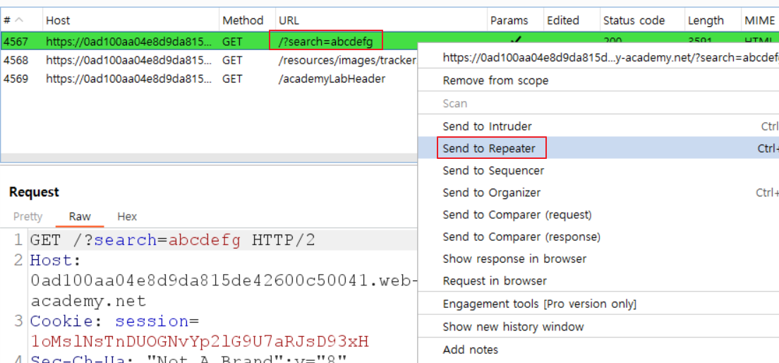 (2) burp suite에서 해당 패킷을 Repeater로 보내서 확인합니다.