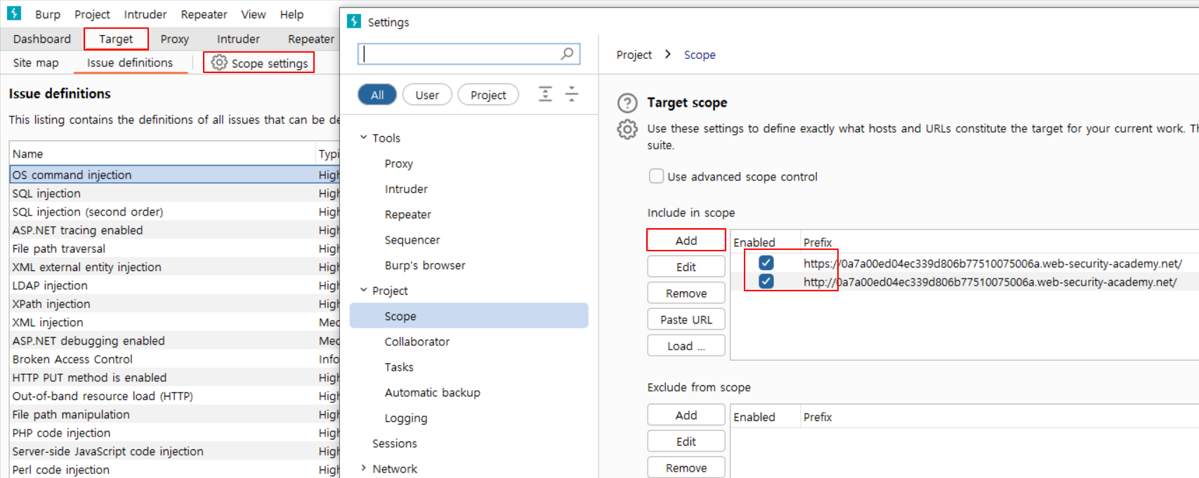 Target에서 Scope settings를 클릭합니다. Add를 눌러 해당 사이트의 패킷만 받을 수 있도록 주소를 https와 http 두 개를 추가합니다.