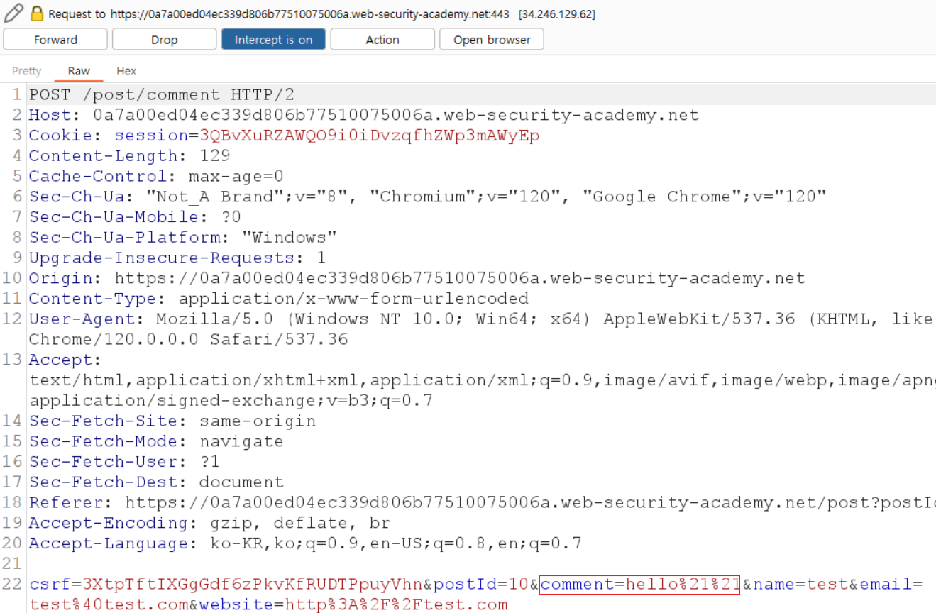 (6) Post Commnet를 클릭하고 burp suite를 보면 다음과 같이 comment 부분에 댓글 내용이 들어간 것을 볼 수 있습니다.