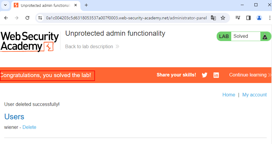 (2) /administrator-panel 로 접속하여 carlos 사용자를 삭제합니다.