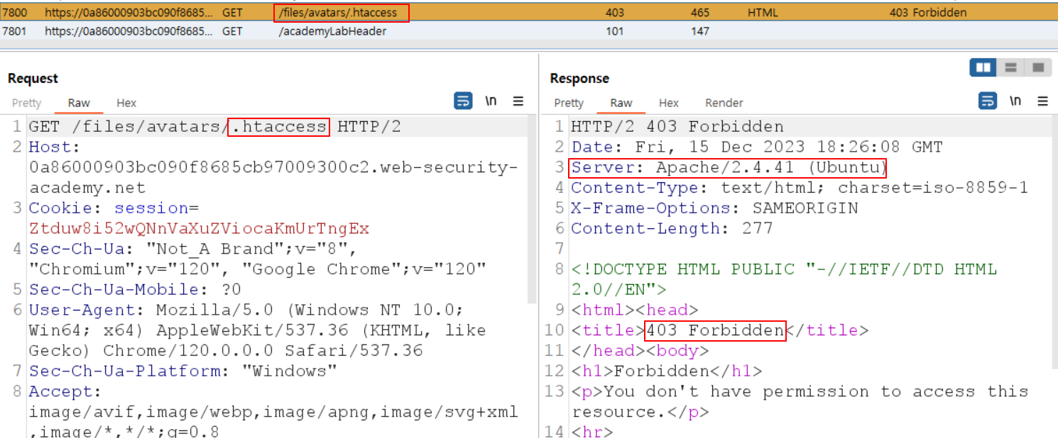 .htaccess 파일 업로드 패킷을 보면 403 Forbidden이 출력되지만 정상적으로 업로드 된 것입니다.