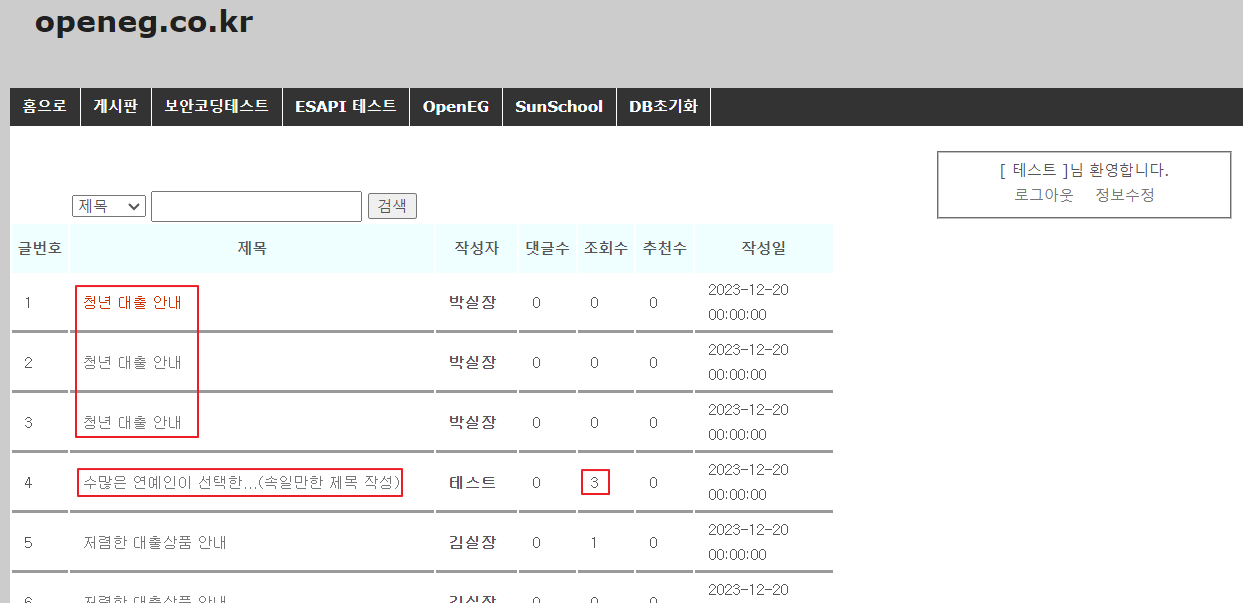 (6) 게시판 코드를 바탕으로 다음 코드를 생성하여 게시글을 등록합니다.