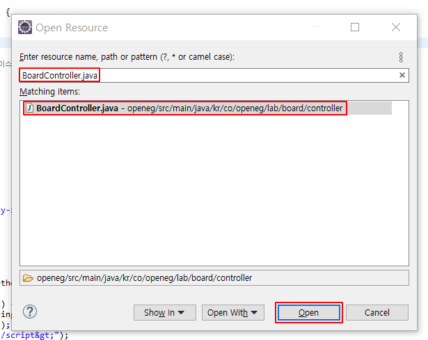 (1) eclipse에서 Ctrl + Shift + R을 눌러 BoardController.Java를 검색합니다.